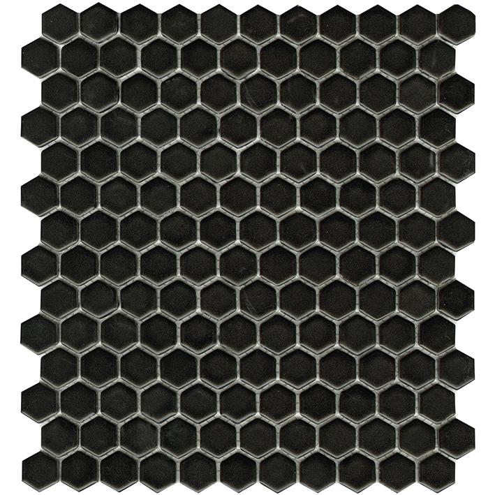 Un mozaic ceramic decorativ cu un model hexagonal uniform cu un finisaj negru mat.