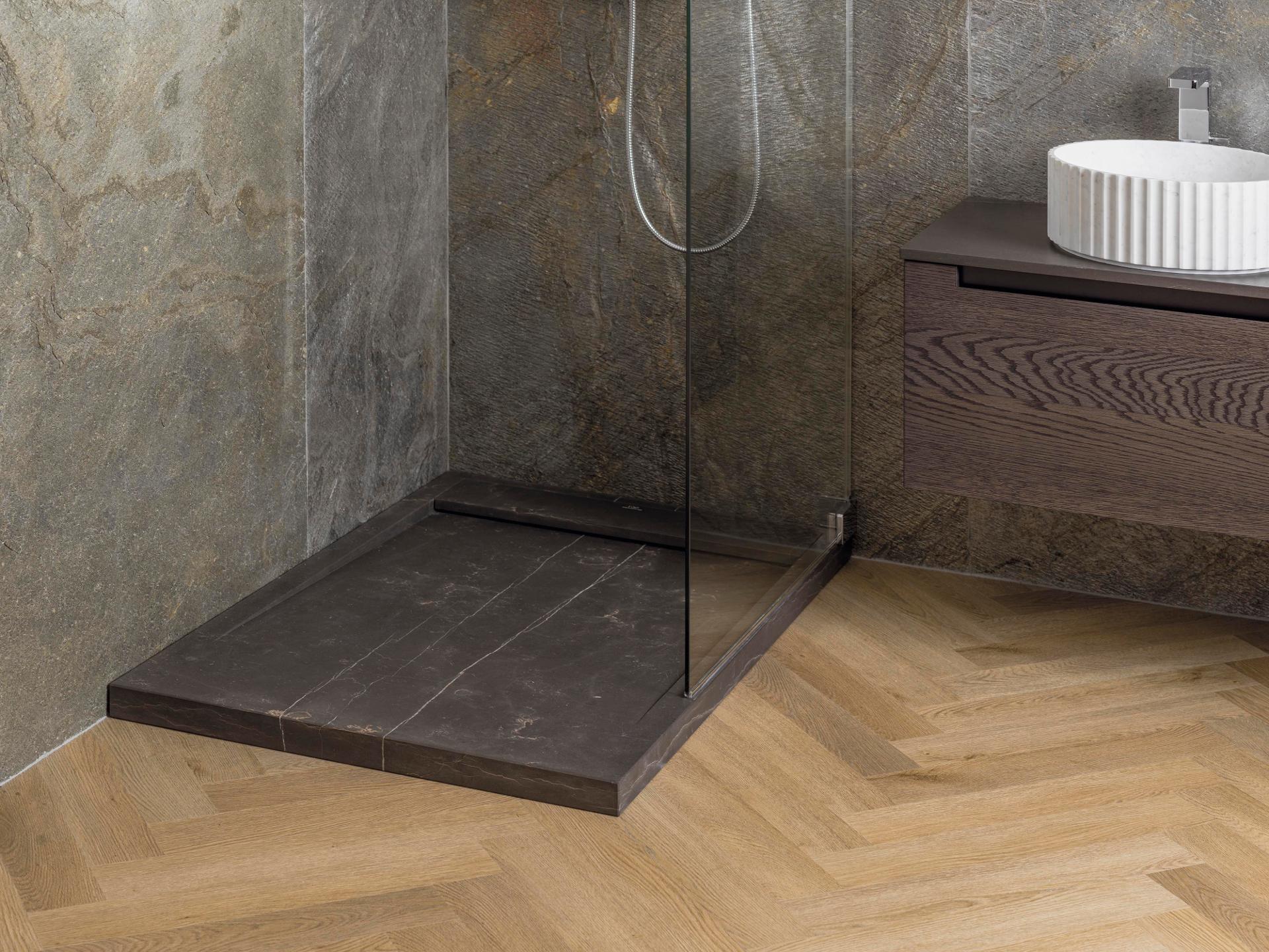 Garnitură de piatră. La cerere, garniturile de scurgere pot fi realizate din același material și finisaj ca și cada de duș.