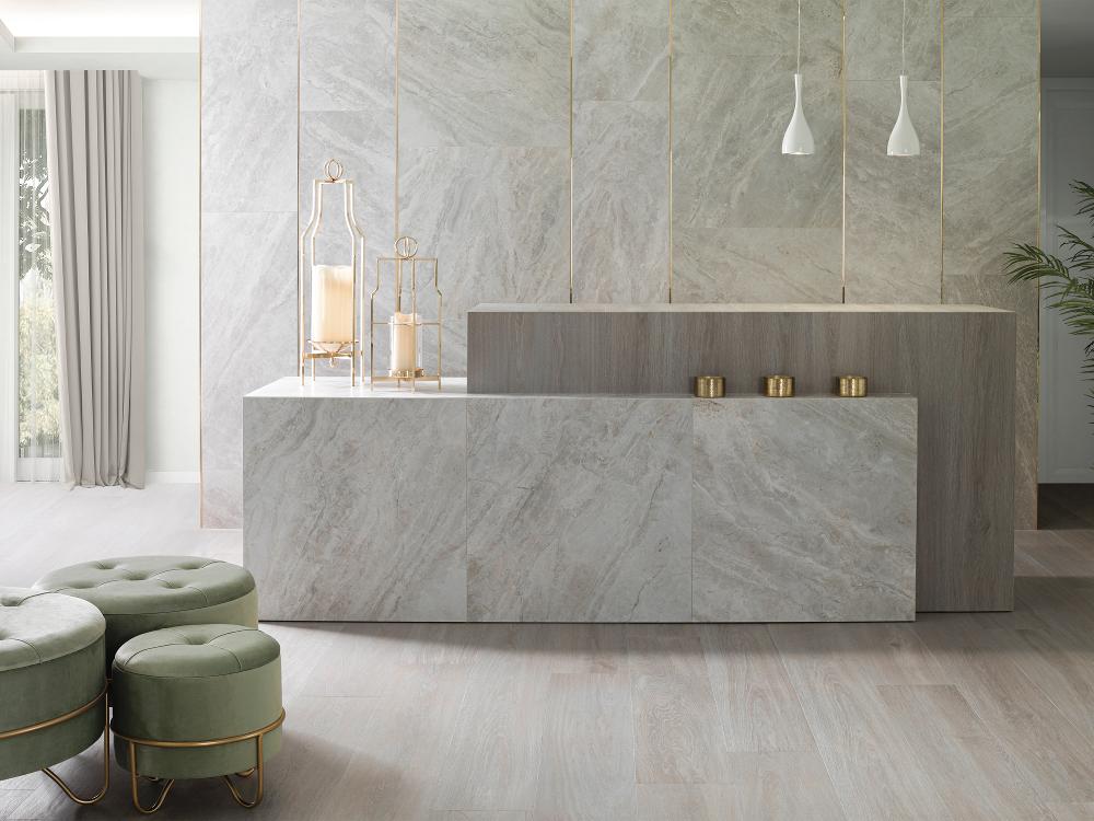Gresie porțelanată, cu un finisaj mat, rectificată. Se poate placa atât în interior cât și în exterior și are aspect marmurat.